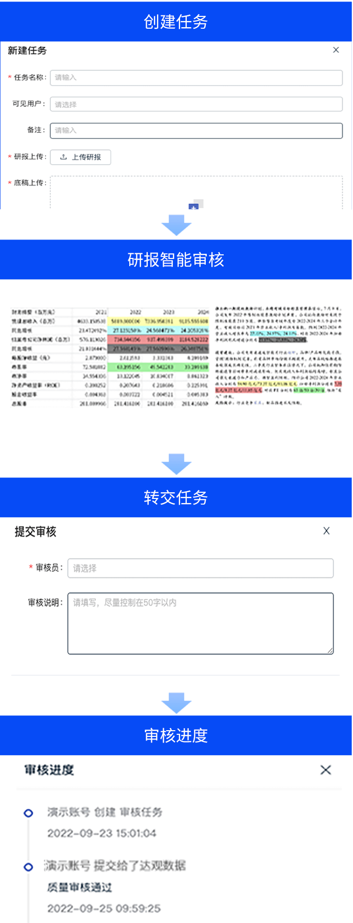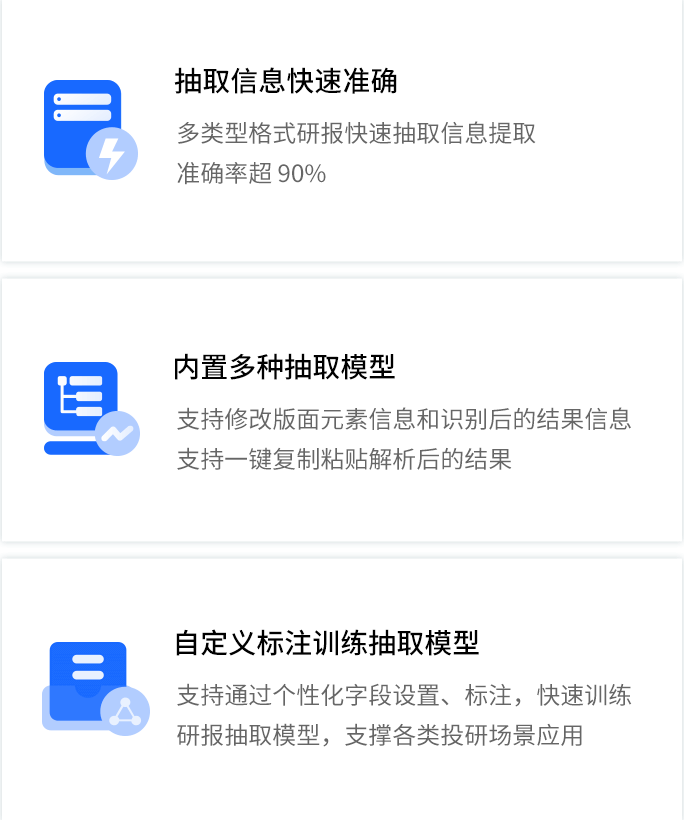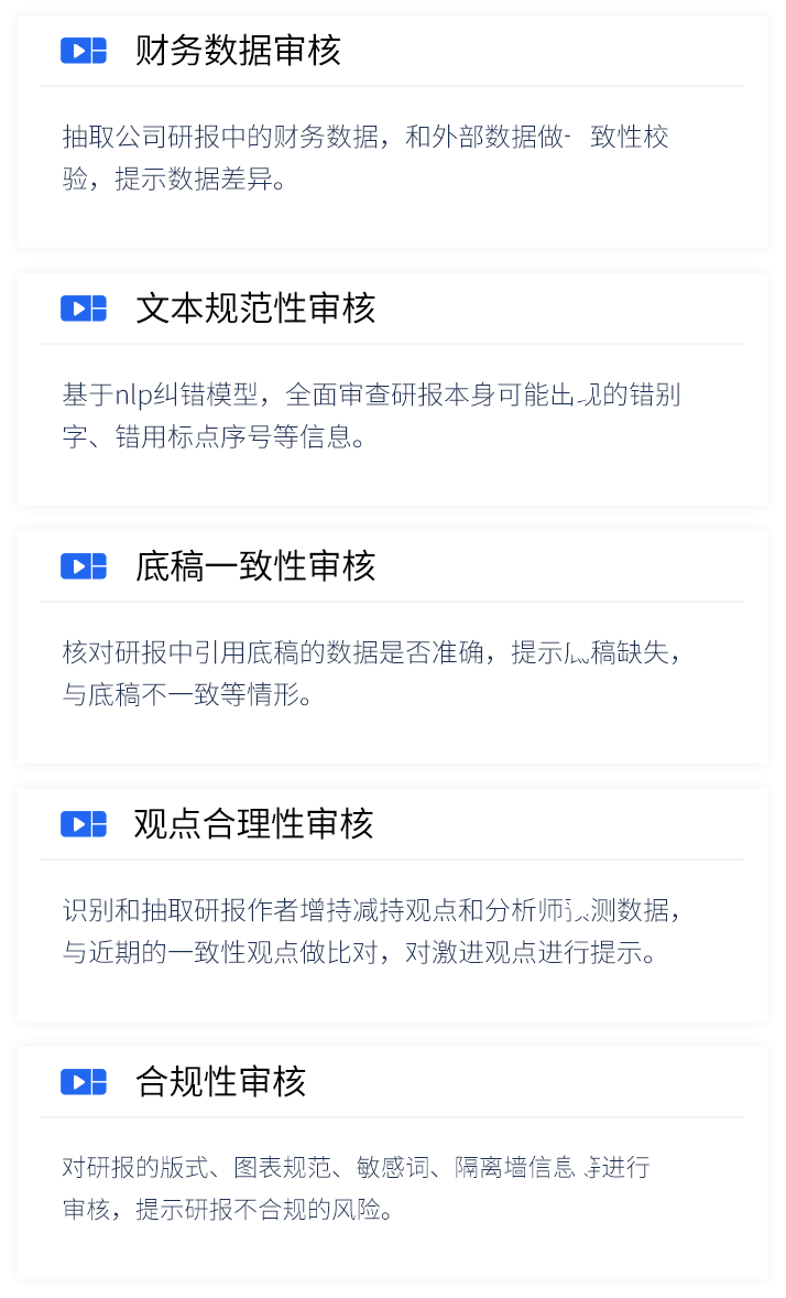 智能研报审核系统是kdpay钱包官网数据为券商研究所、买方研究组织等用户打造的集研报解析、抽取、审核、管理功能为一体的产品。集成OCR、NLP、机器学习等技术,对研报和底稿信息进行多方面抽取,并对研报进行数据、文本、观点等全方位的自动化审核, 同时对研报和底稿进行规范化、流程化管理,帮助用户提升工作效率,把控研报发布的时效性和合规性,全面降低出错风险。